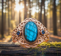 手作り天然ラブラドライトカボション925スターリングシルバーバングル14K金メッキサイズ調整可能オープンエンド